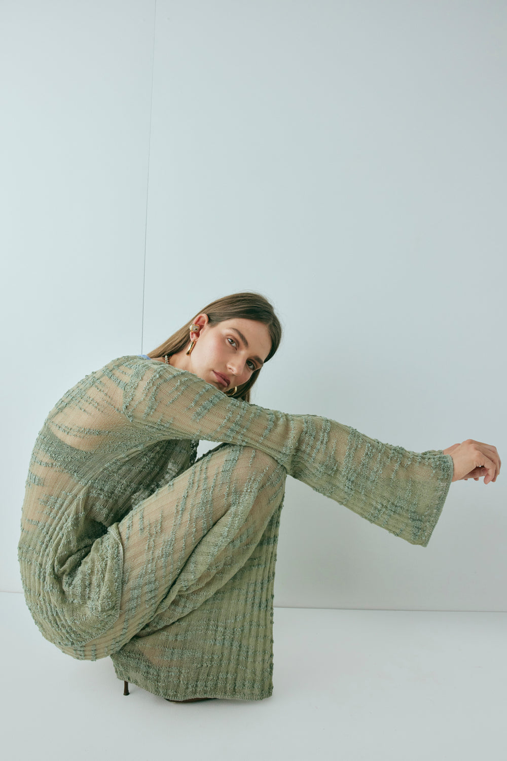 The Aliya Knit Flare Pants Khaki are knitted in a ribbed textured yarn, and feature an elastic waistband. Designed in Australia.