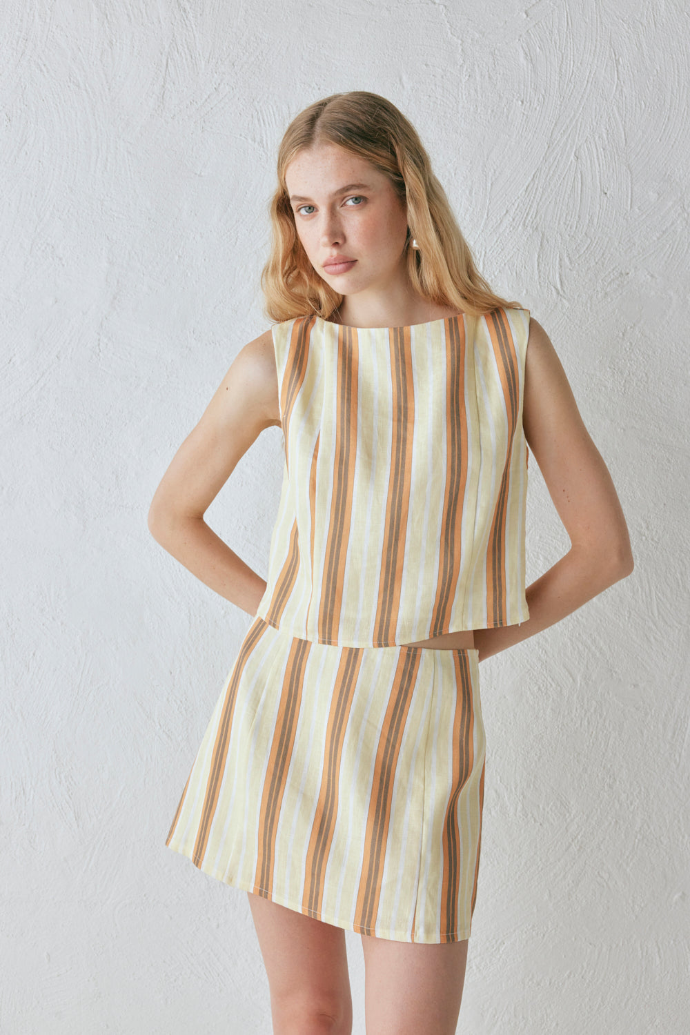 This Stripe Linen Mini Skirt showcases an exclusive in-house print, that is made from 100% linen. It is fully lined with a side seam zip. Designed in Australia.