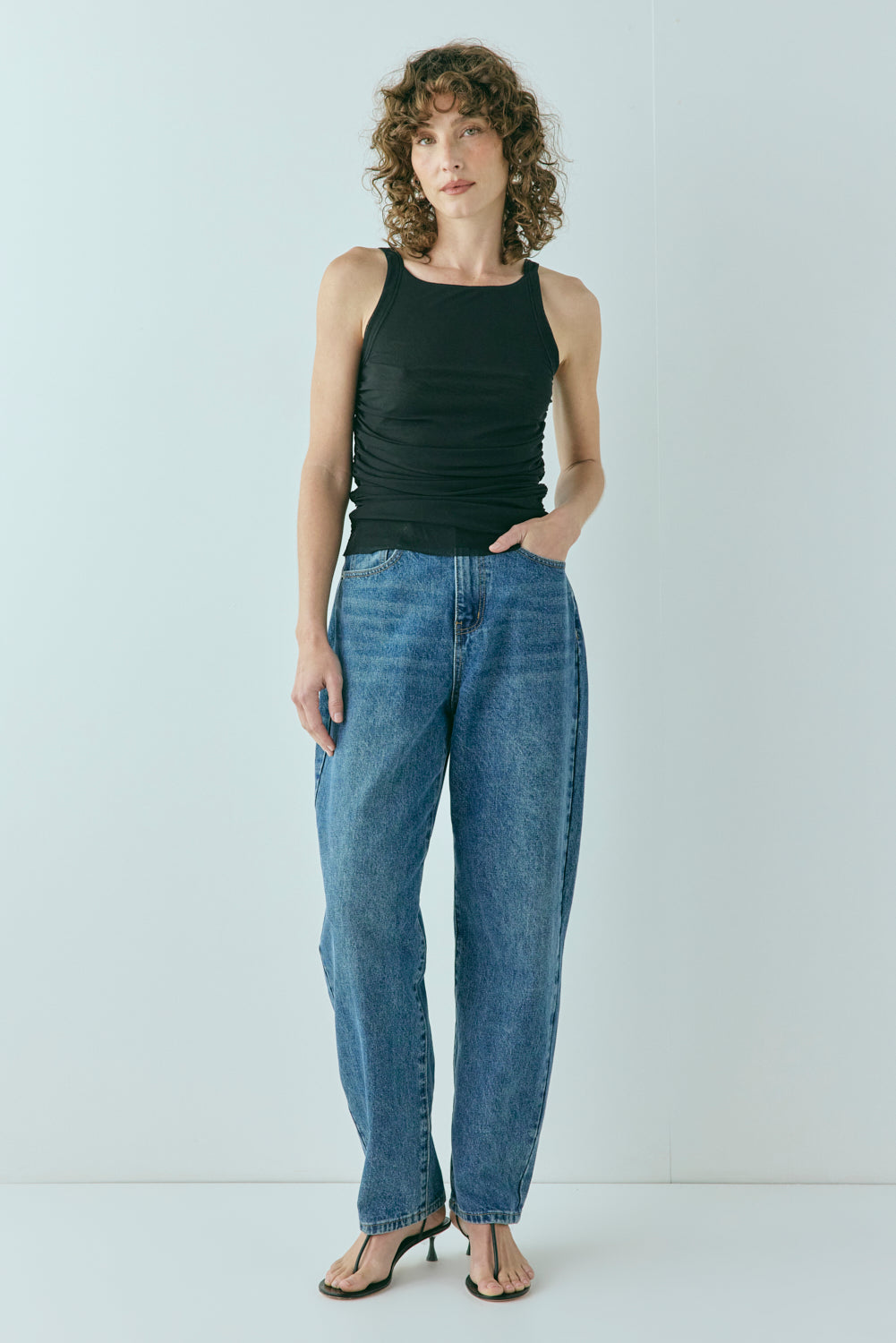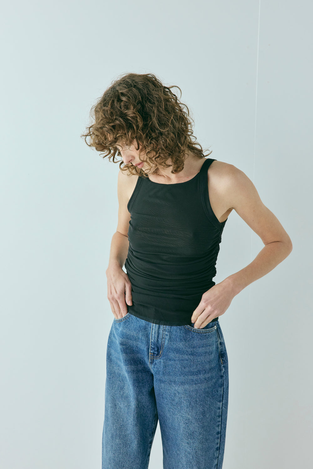 The Andi Mesh Top in Black. Created with a low straight back, ruching detail at sides, multiple layers of mesh and raw cut hem detail. Designed in Australia.