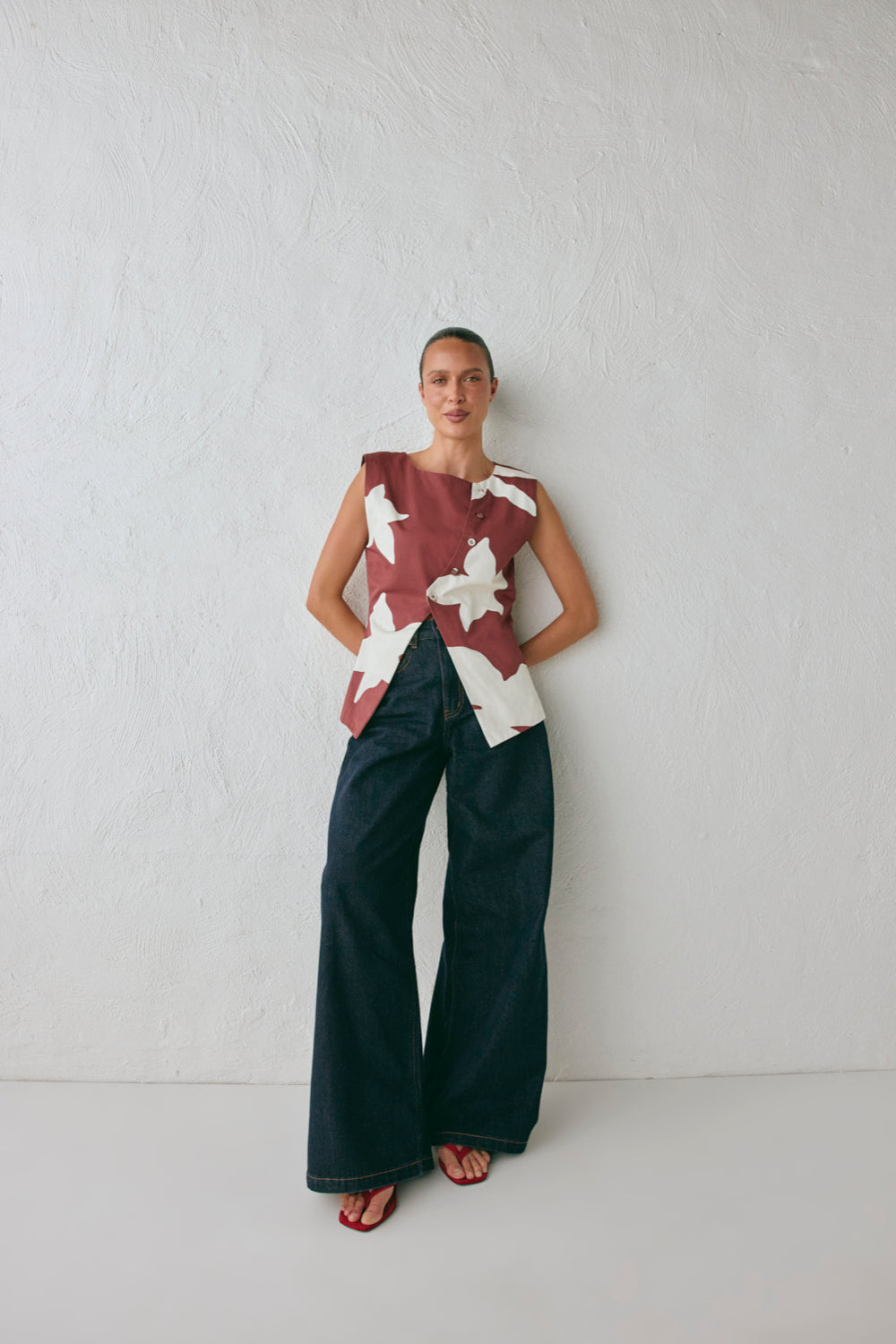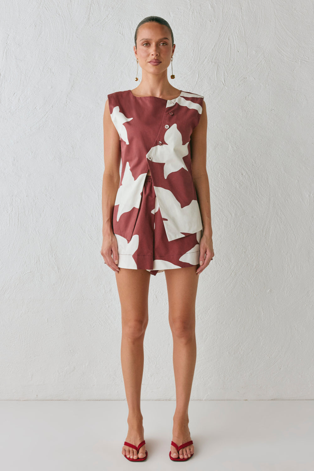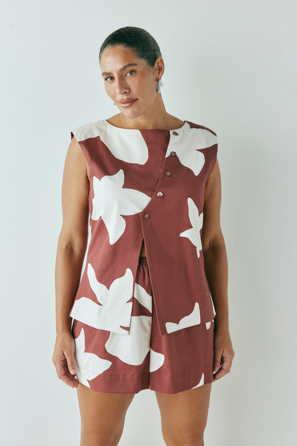 The Aria Vest Ira is made from 100% Cotton. Featuring an exclusive in-house print, asymmetrical front buttons with side and back splits. Designed in Australia.