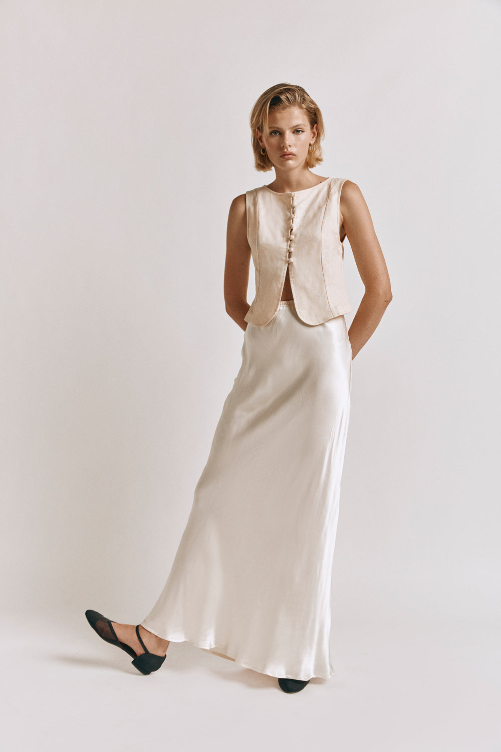 The Celeste Linen Top in Cream. Made from 100% linen, with front buttons and a lace-up back design. Designed in Australia.