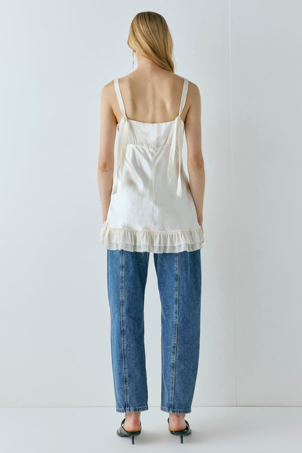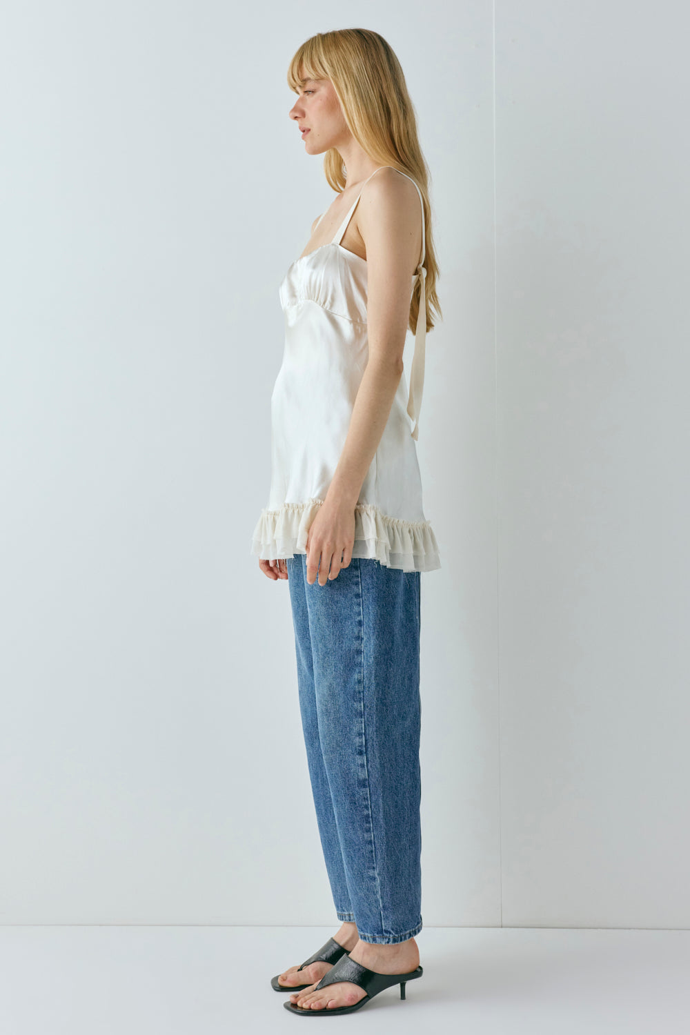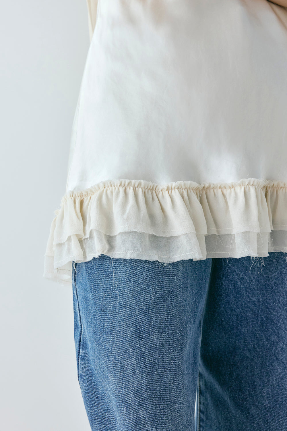 The Cher Satin Top in cream. Created with adjustable tie up straps, lining and a frill hem detail. Designed in Australia.