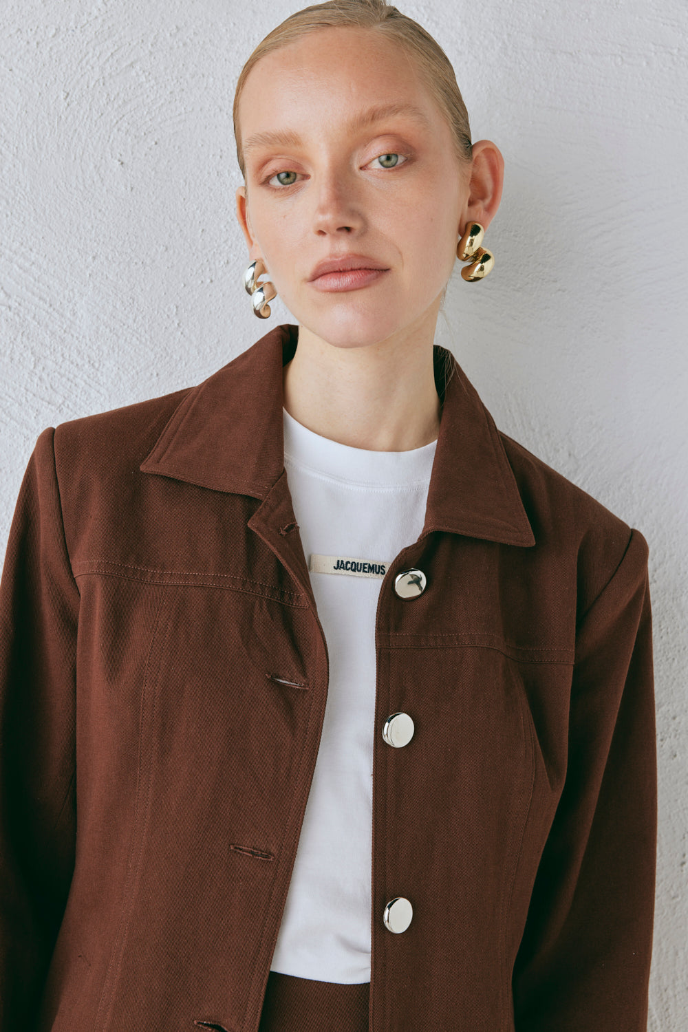The Esti Jacket in Chocolate. Made from cotton, fully lined with padded shoulders. Designed in Australia.