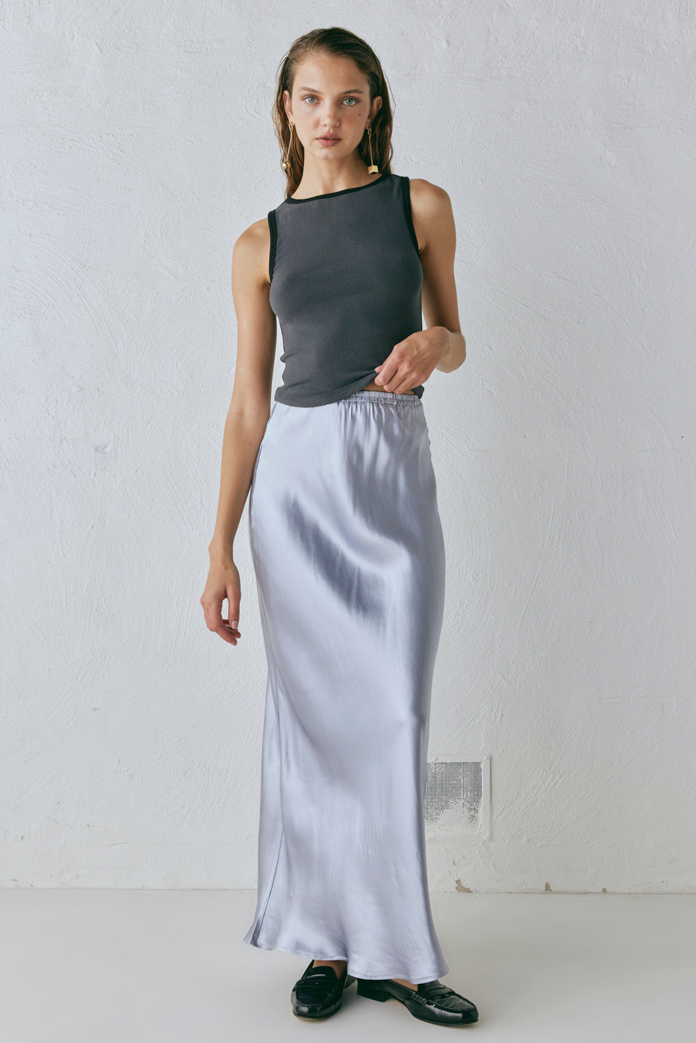 The Florence Bias Cut Maxi Skirt in Pearl . Created on the bias cut with an elastic waist. Designed in Australia.