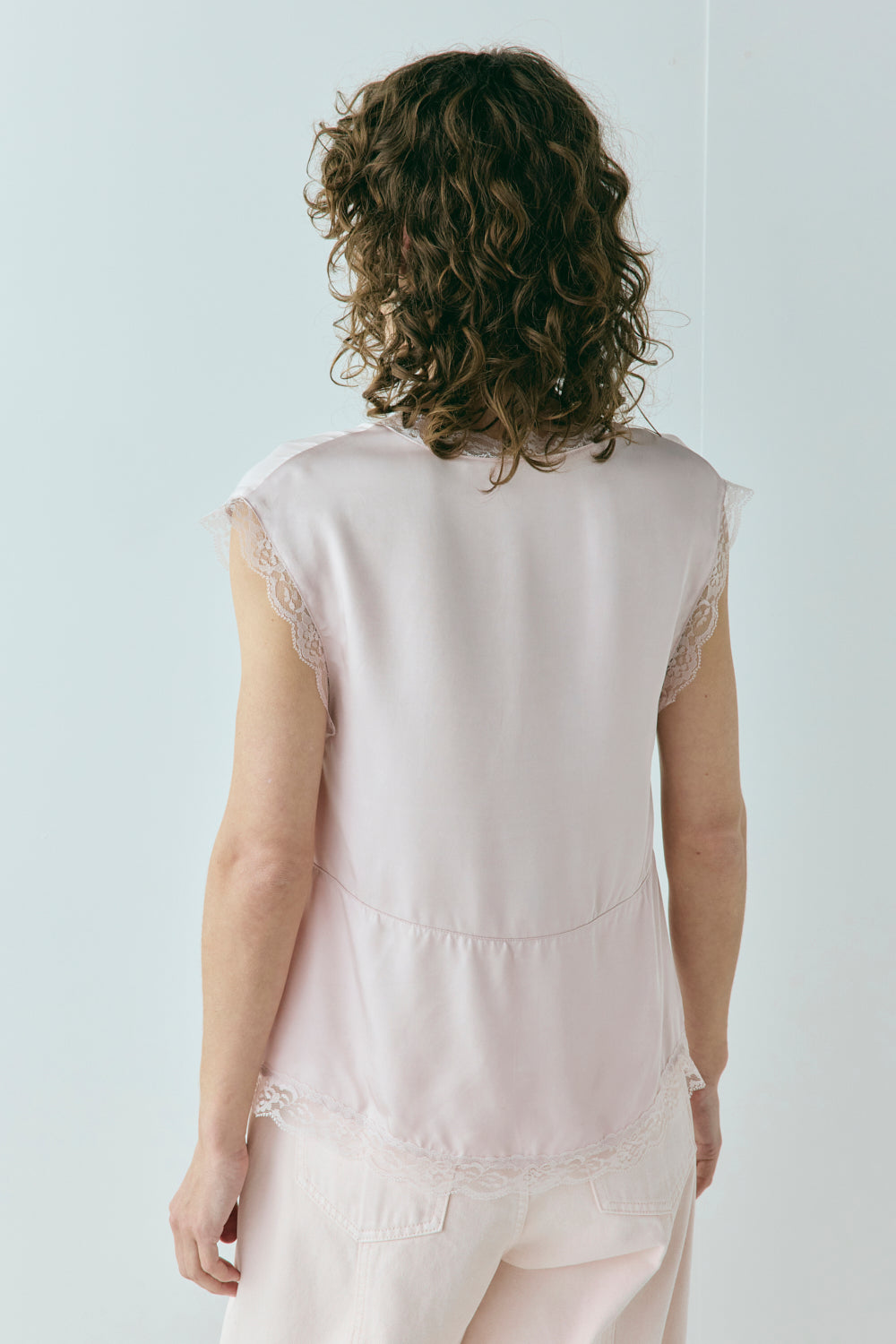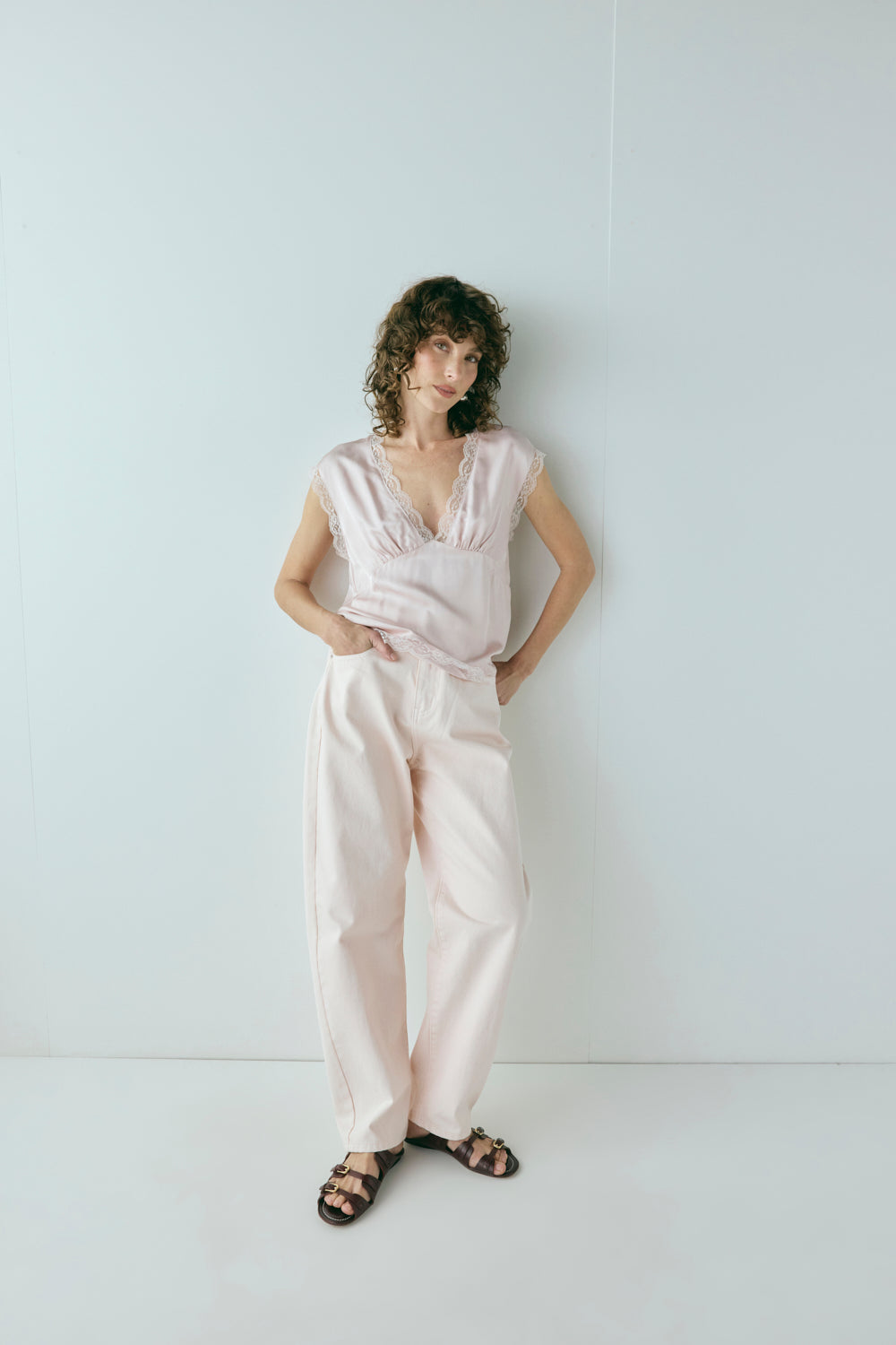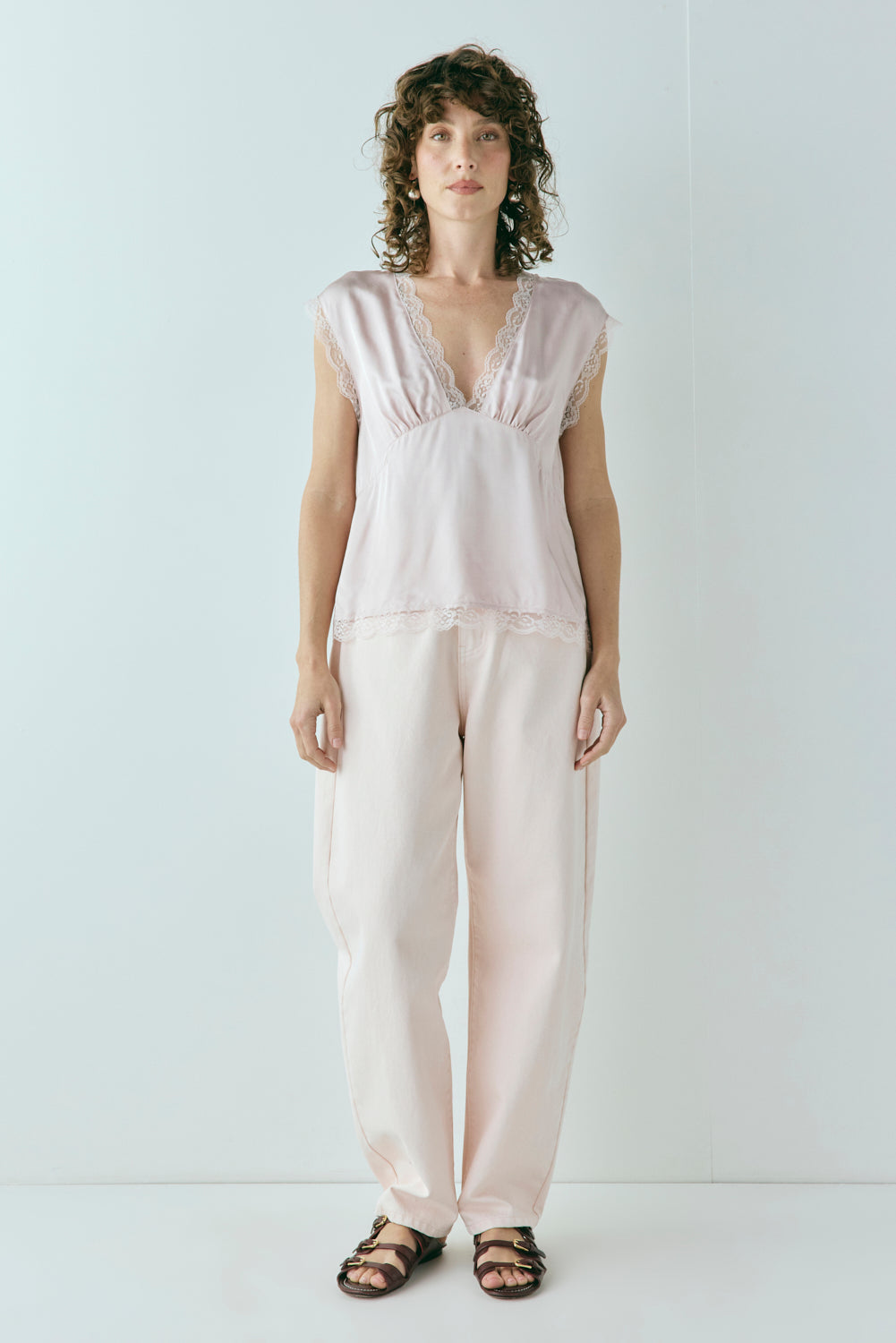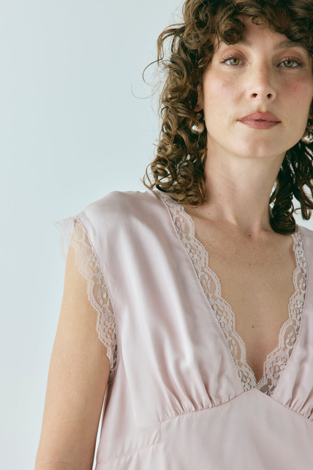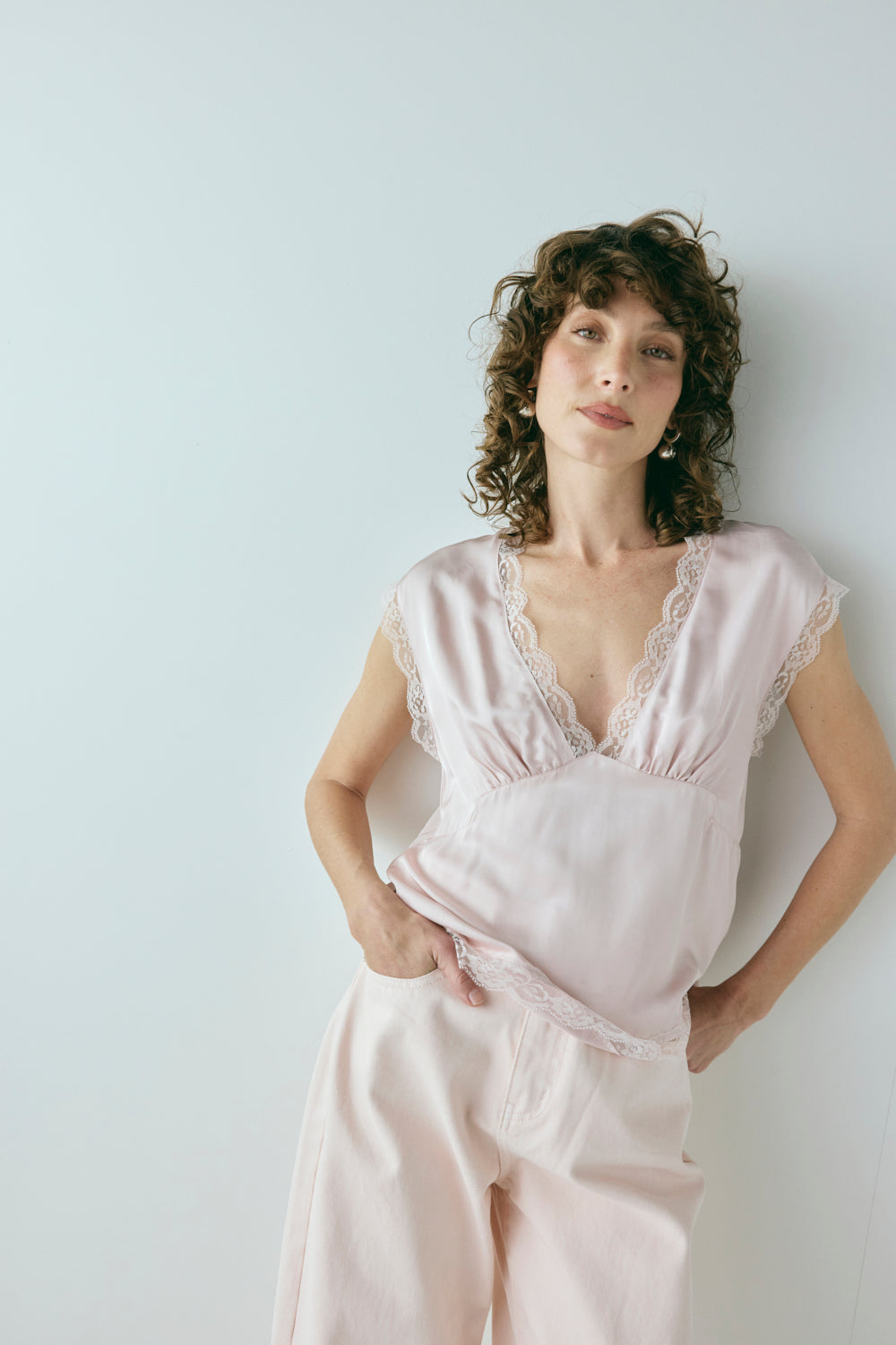 The Flores Satin Top in Musk. Features lace trim detailing, gathered under bust and V-neck design. Designed in Australia.