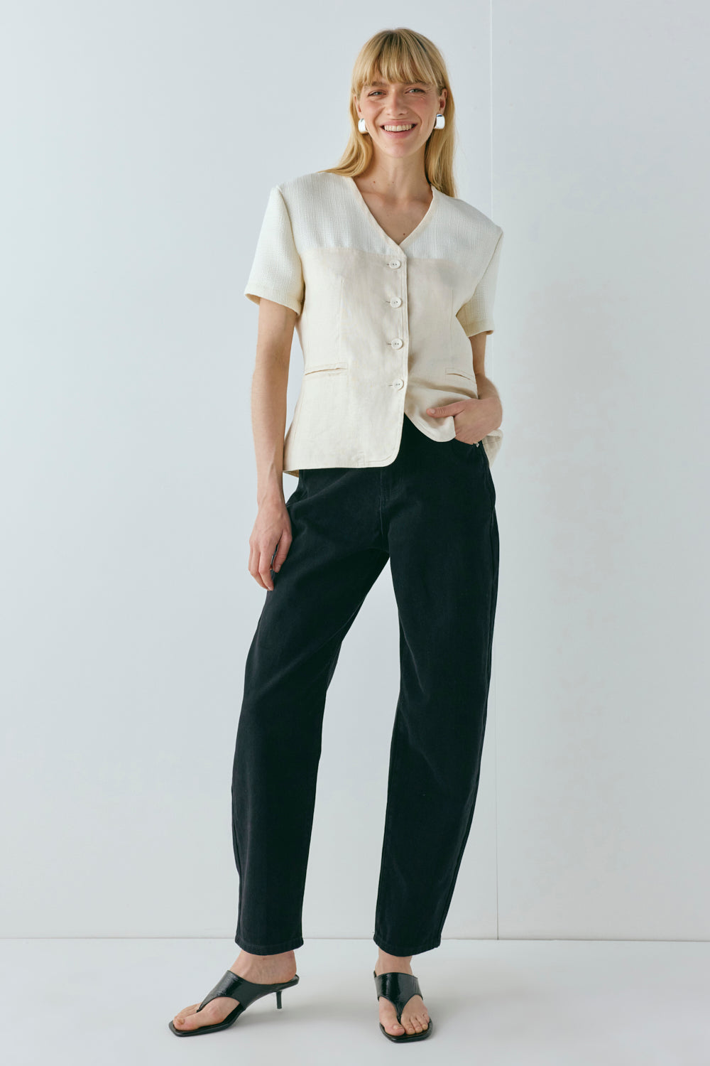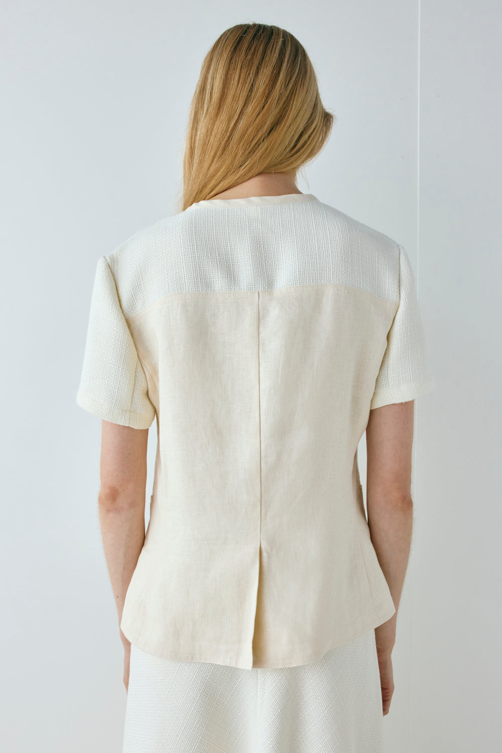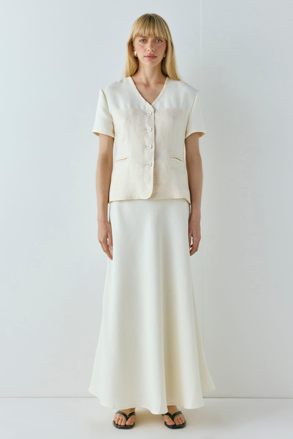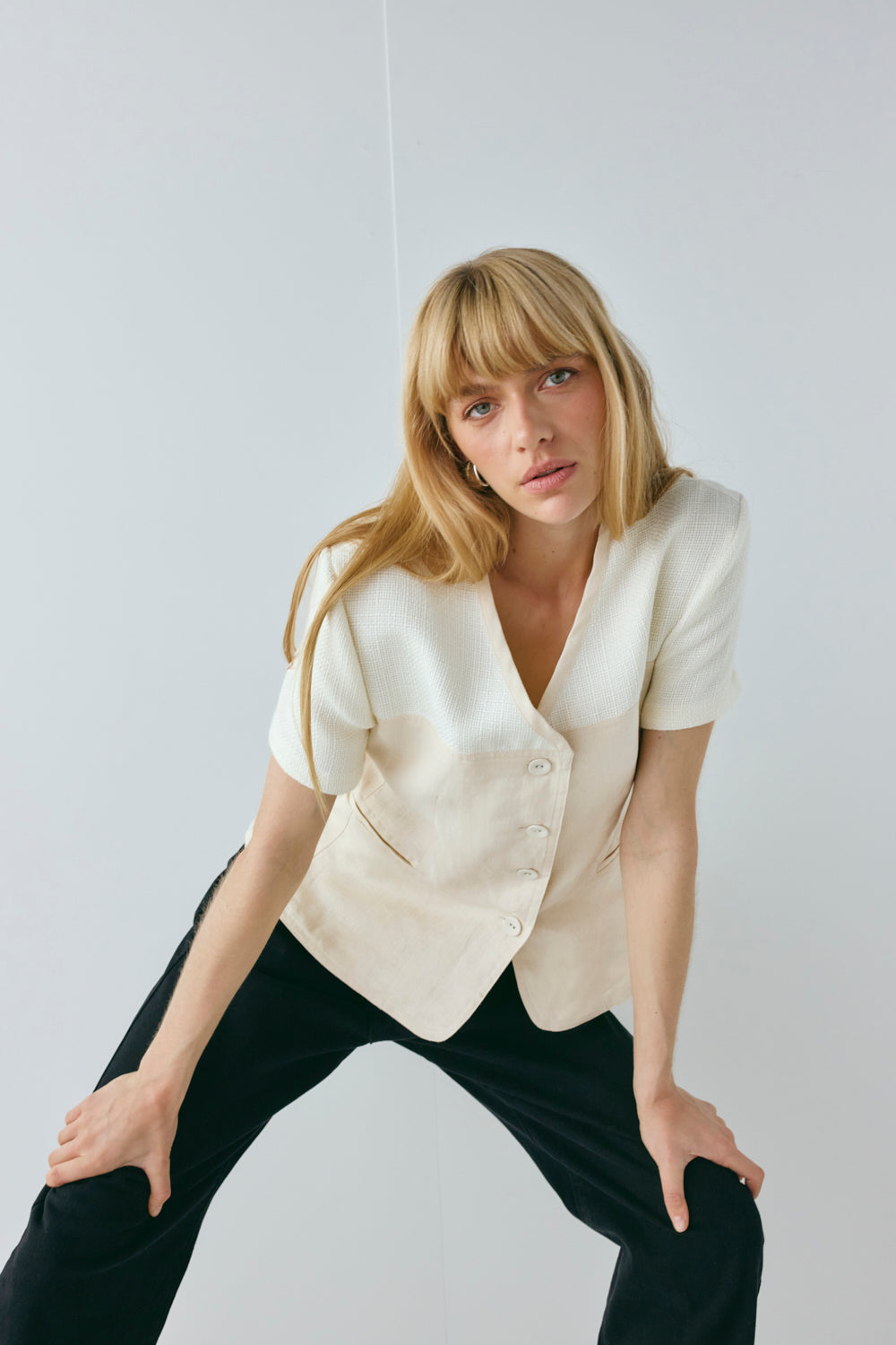 The Hazel Top Cream is created with textured woven fabric sleeves and front and back yoke,  spliced with a 100% linen fabrication. It features a v-neck, front button closure and welt pocket detail. Designed in Australia.