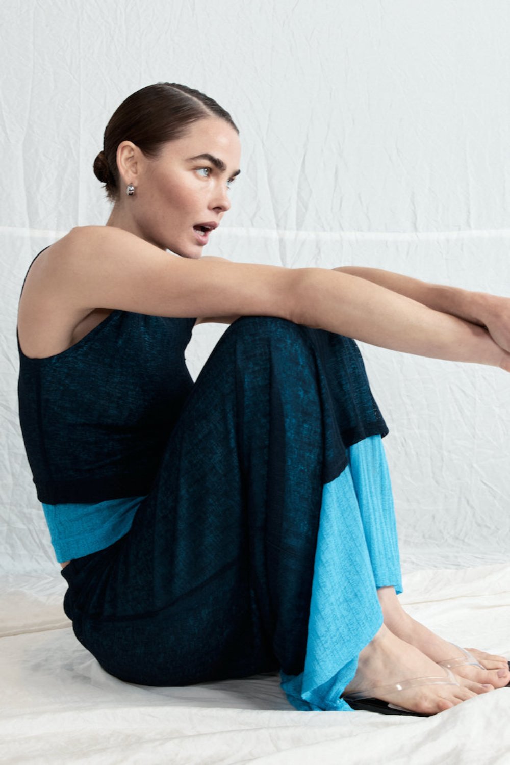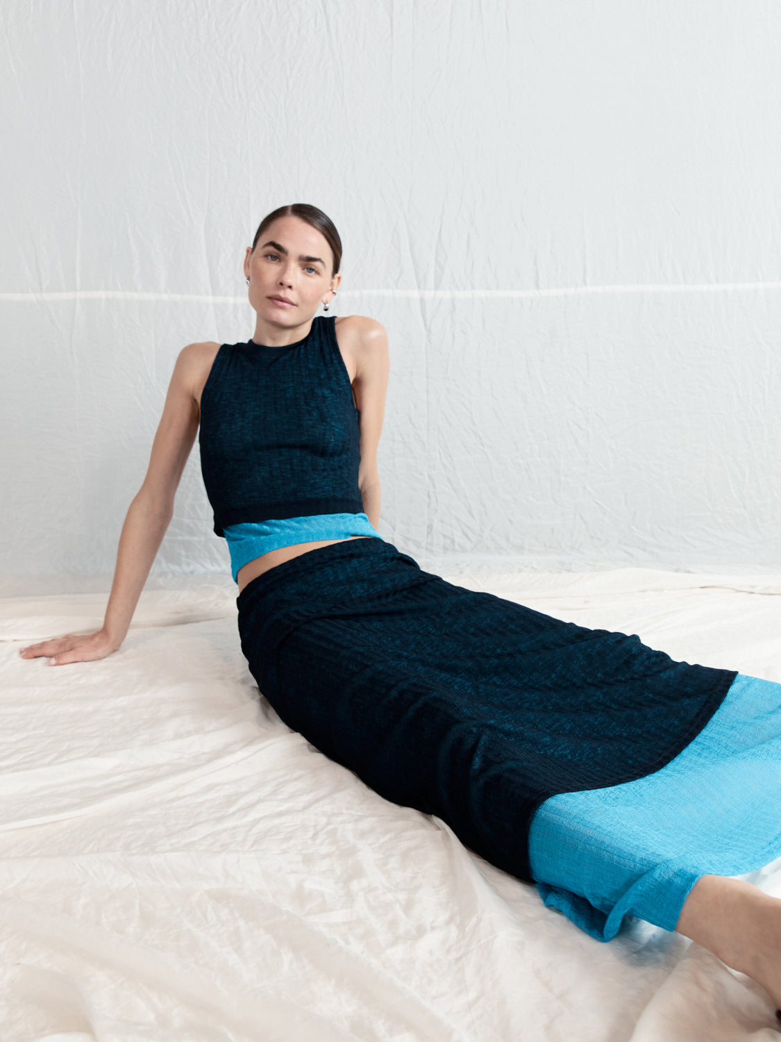The Jil Maxi Skirt in Navy. Designed in a stretch knit fabric, with a contrast double layer and elastic waist. Designed in Australia.