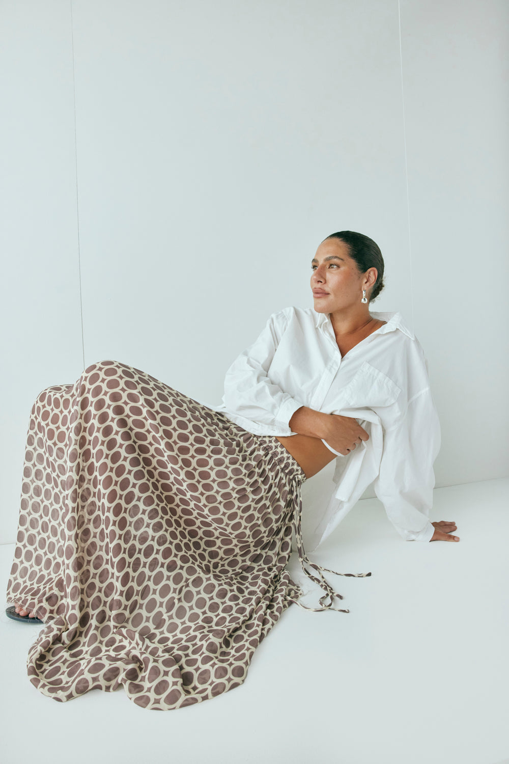 Jordan Maxi Skirt Fae features an exclusive in-house print. Includes a detachable mini skirt lining, elastic waist & adjustable side ties. Designed in Australia.