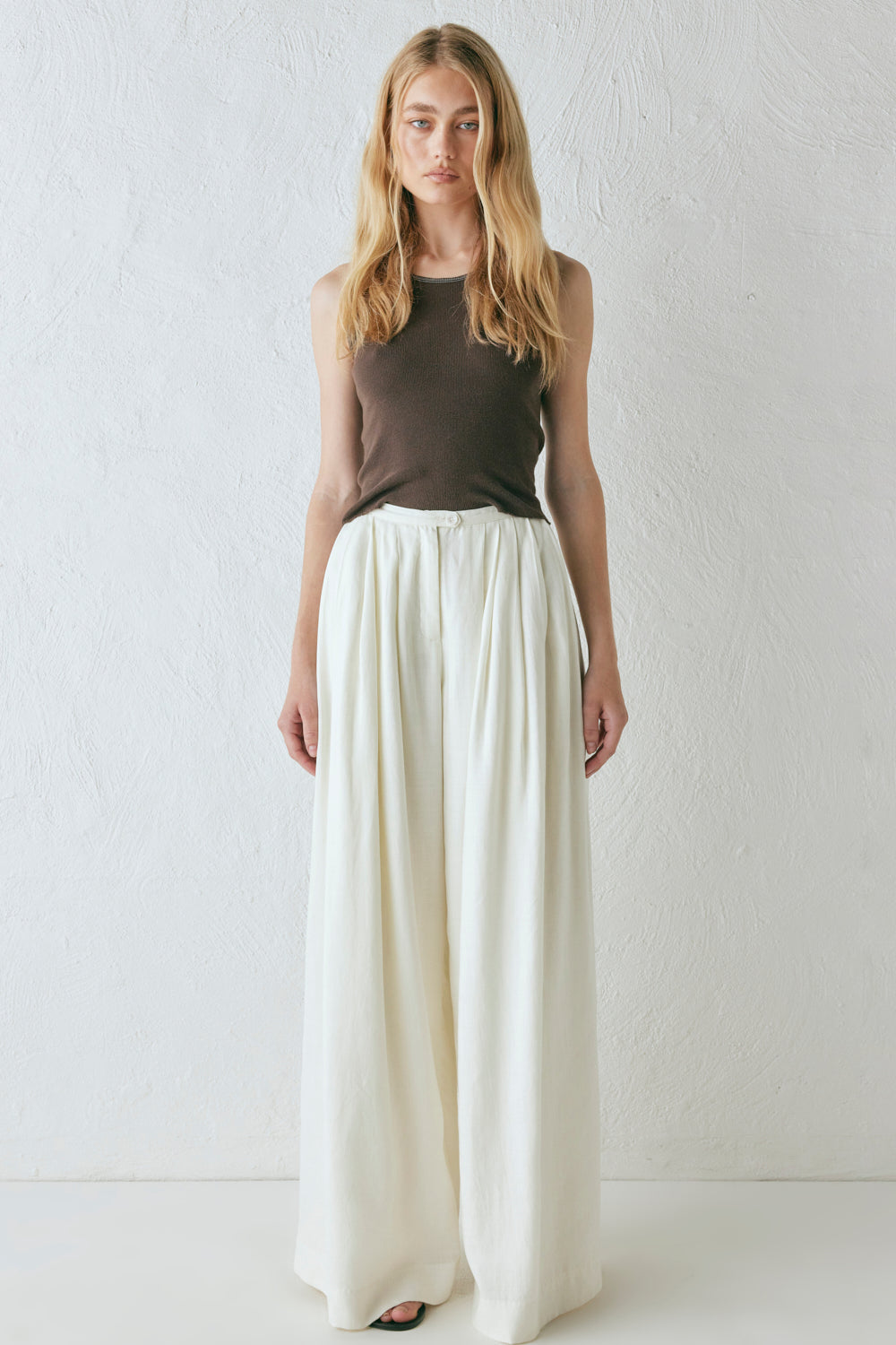 The Luca Pants in Off-White . Made from a linen blend with a cotton lining. Featuring front and back pleats and front zip with button closure. Designed in Australia.