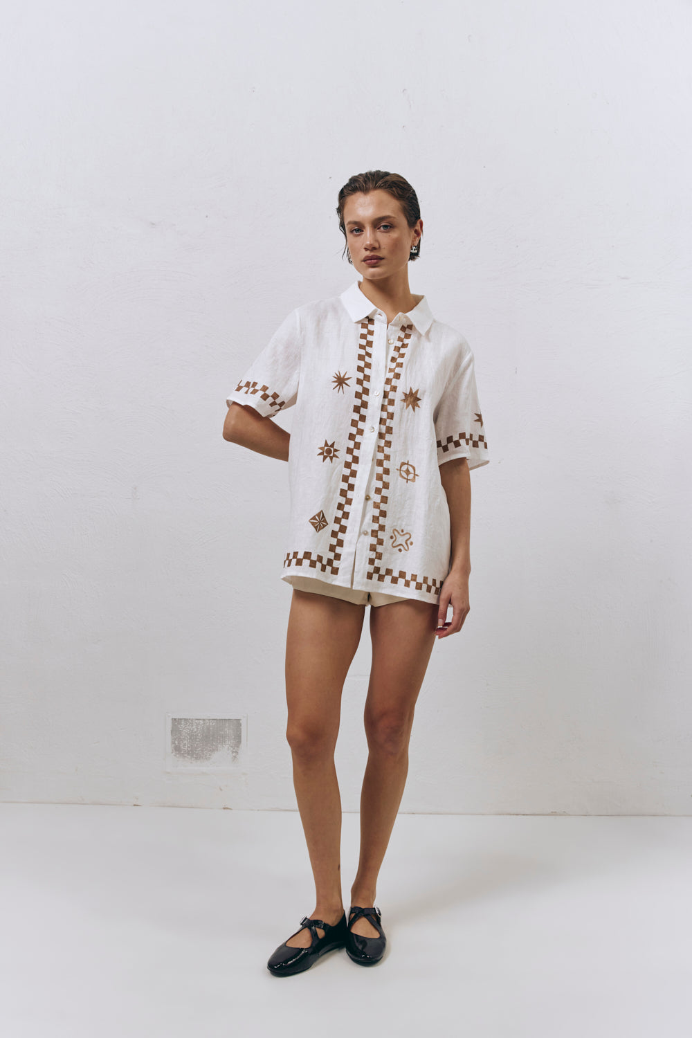 Inspired by our travels along the winding roads of the Amalfi coast... Our best selling Mediterranean Blue Linen Shirt is now available in Brown! This lightweight linen number is a relaxed fit & features an exclusive print hand painted by our VRG GRL designers, we're obsessed!