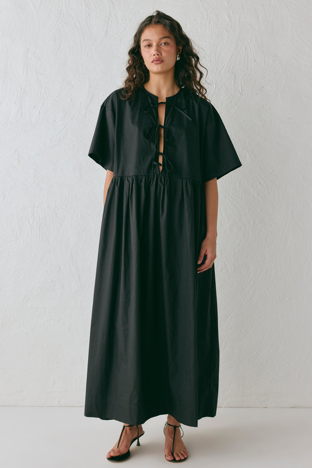 Naomi Smock Maxi Dress is made from 100% Cotton. This style is intended to be a boxy fit featuring centre front ties. Designed in Australia.