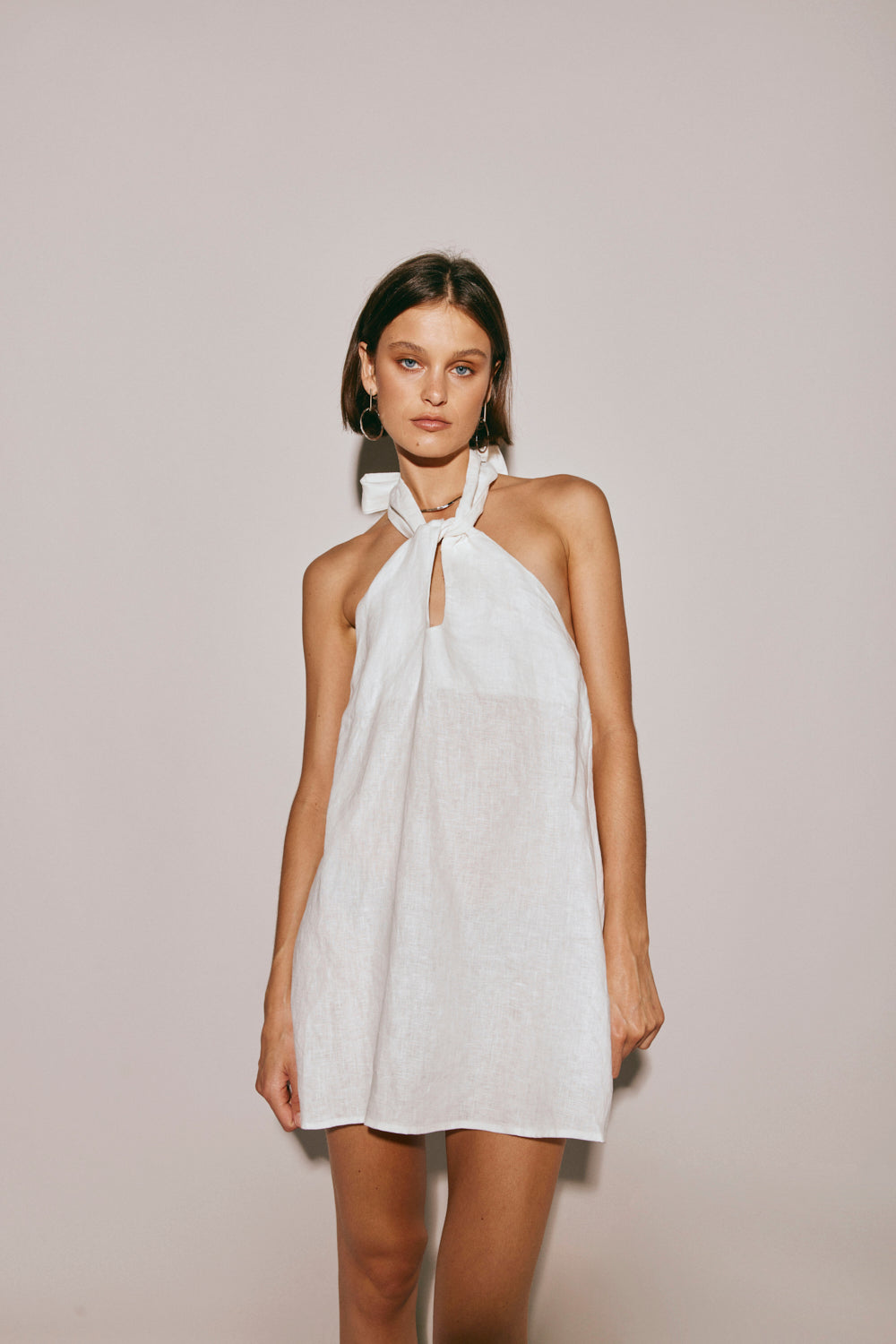 The perfect mini dress for those hot summer days that melt into long summer nights. Made from a breathable linen fabric, this dress will keep you cool and comfortable. The halter neck design & open back will give you the most flattering silhouette.
