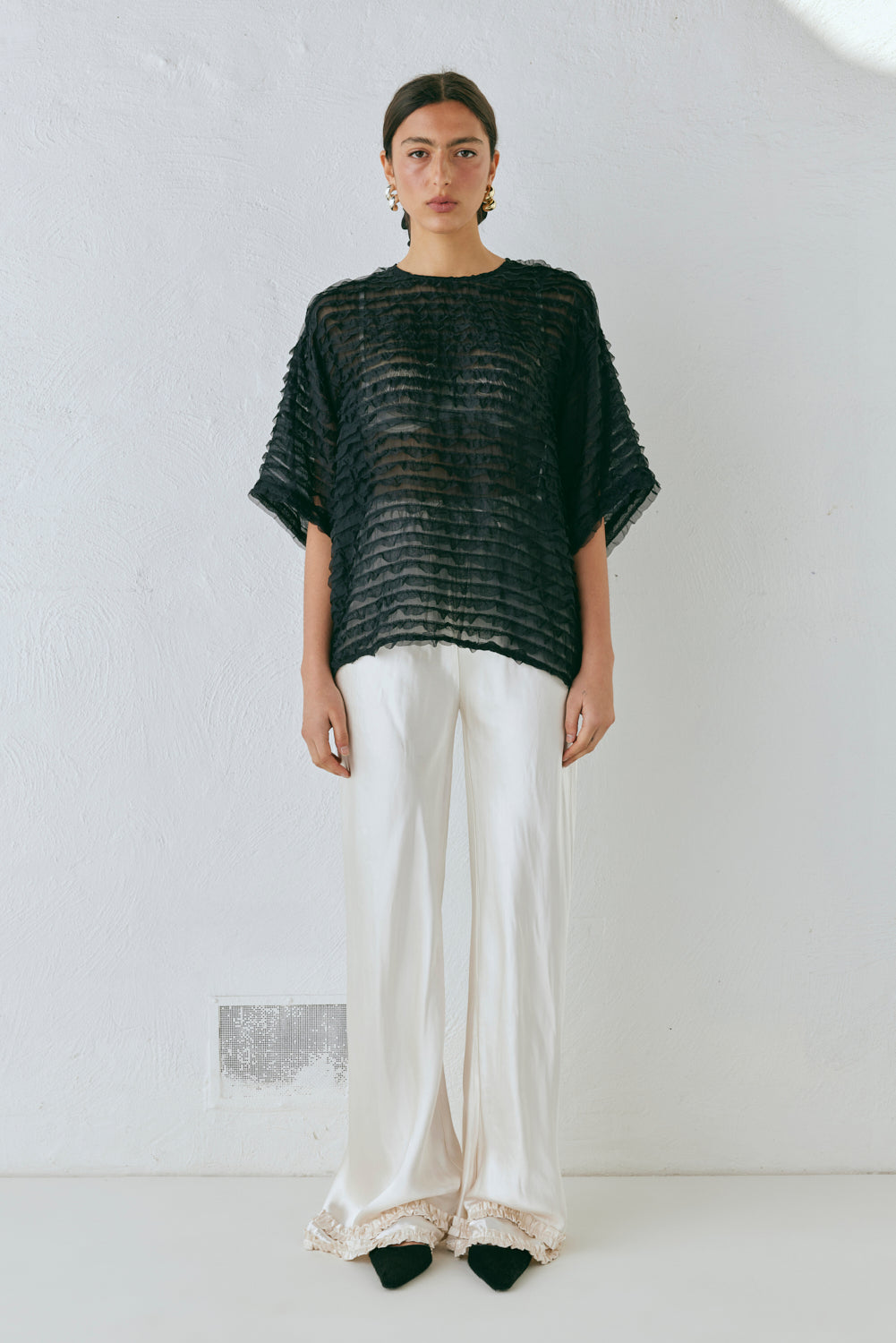 Reya Top Black is designed with a slightly sheer, frill detail & back keyhole cut-out with button. Designed in Australia.