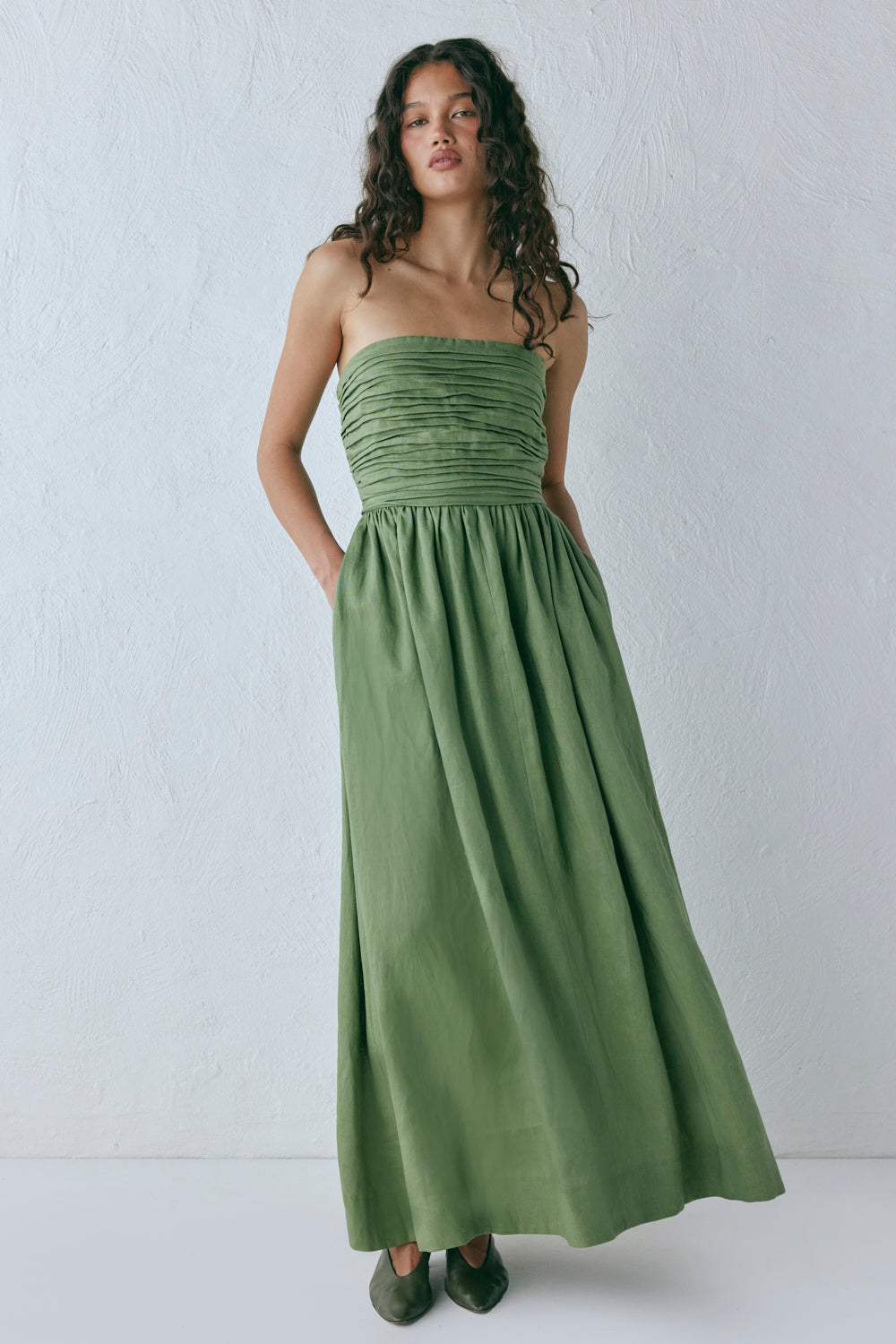 The Saint Malo Linen Maxi Dress Olive features a gathered bust and A-line skirt, made with linen and fully lined in 100% cotton. Designed in Australia.