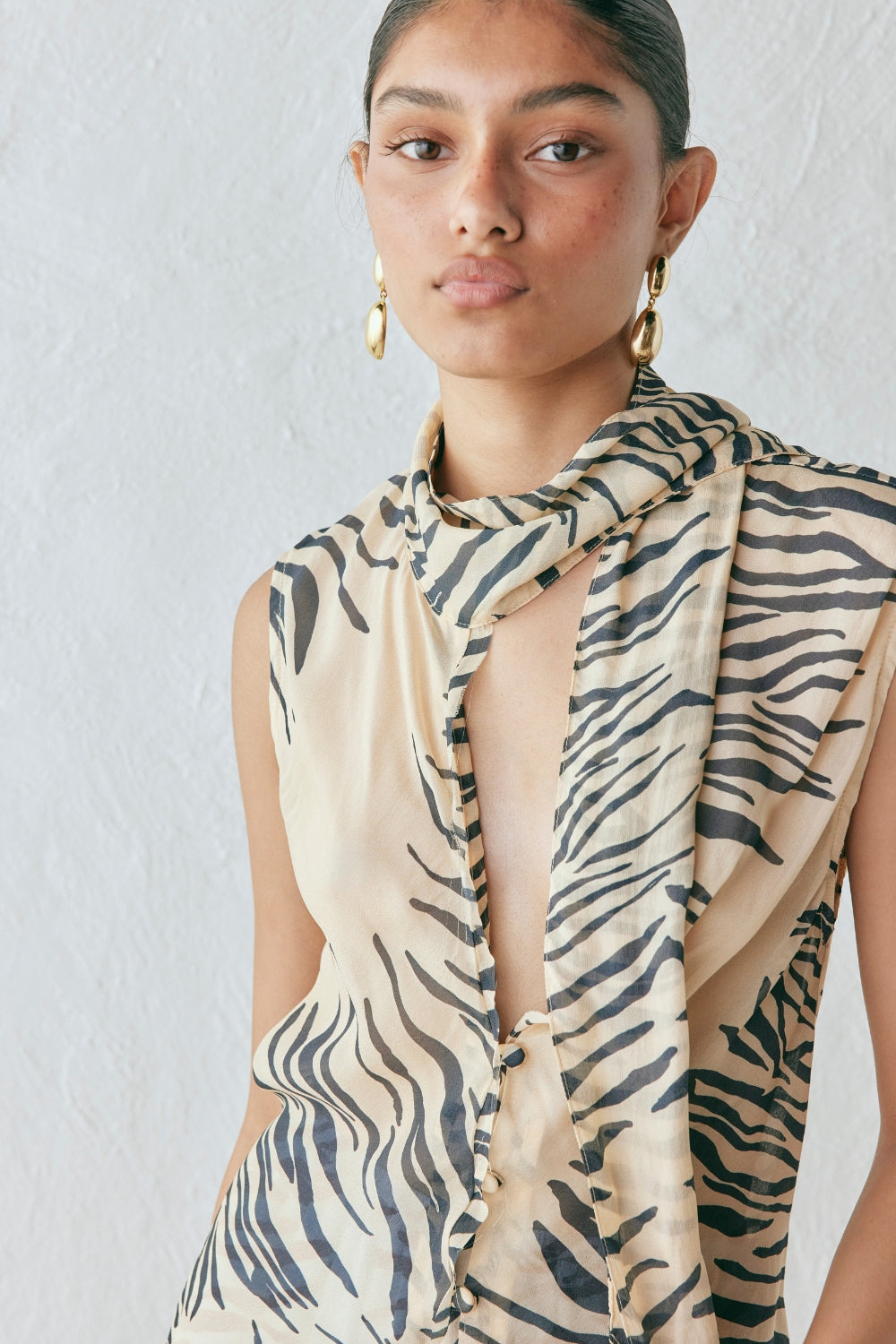 The Sava Top showcases an exclusive in-house tiger print. Featuring a bias cut, centre front buttons, built-in scarf design & tie back. Designed in Australia.