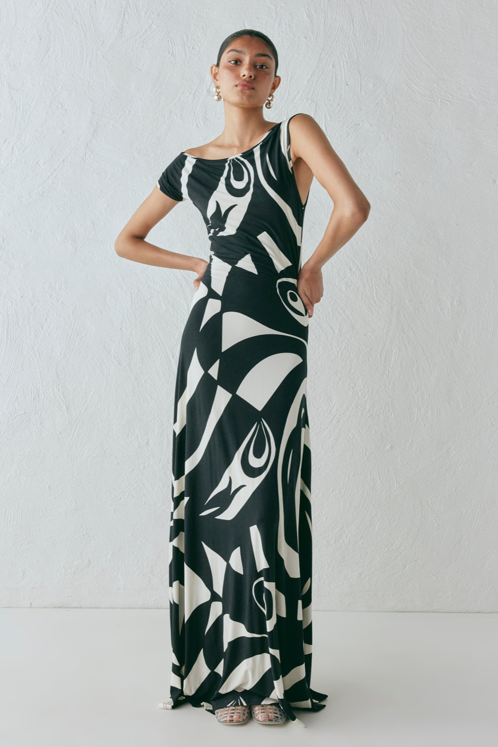The Uma Maxi Dress Ari features an exclusive in-house print. Crafted from a soft bamboo blend & fully lined design. Designed in Australia.