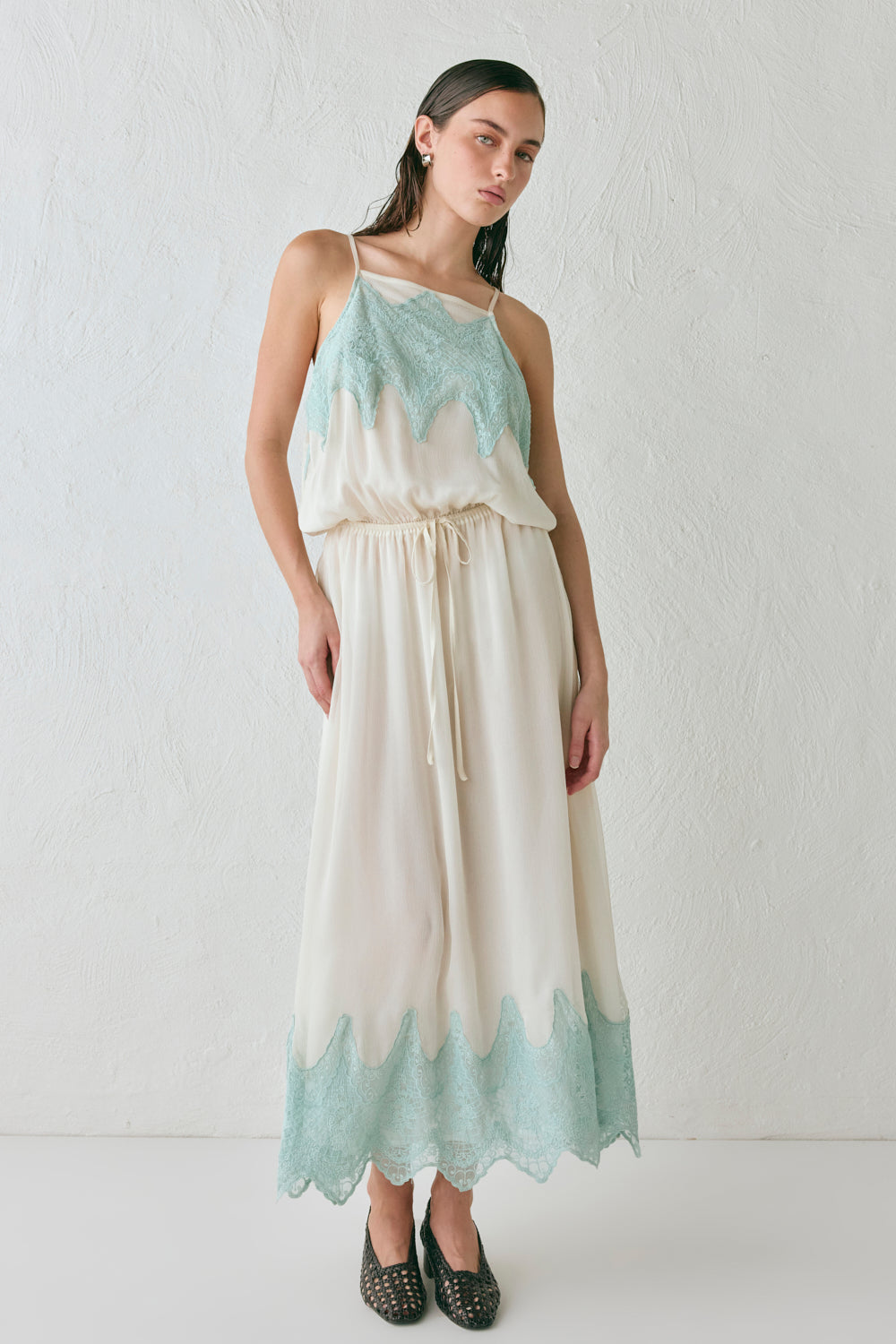 The Valery Midi Dress in Cream features an elastic drawstring waist, contrast lace detailing. Designed in Australia.