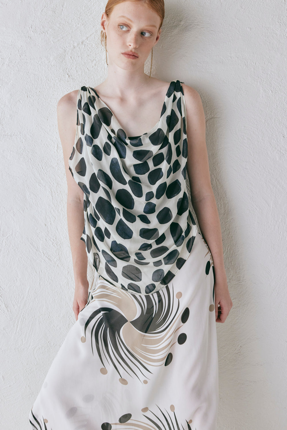 Victoria Top Eni features an exclusive in-house print with a sheer crepe cowl neck overlay & fully lined stretch underlay. Designed in Australia.