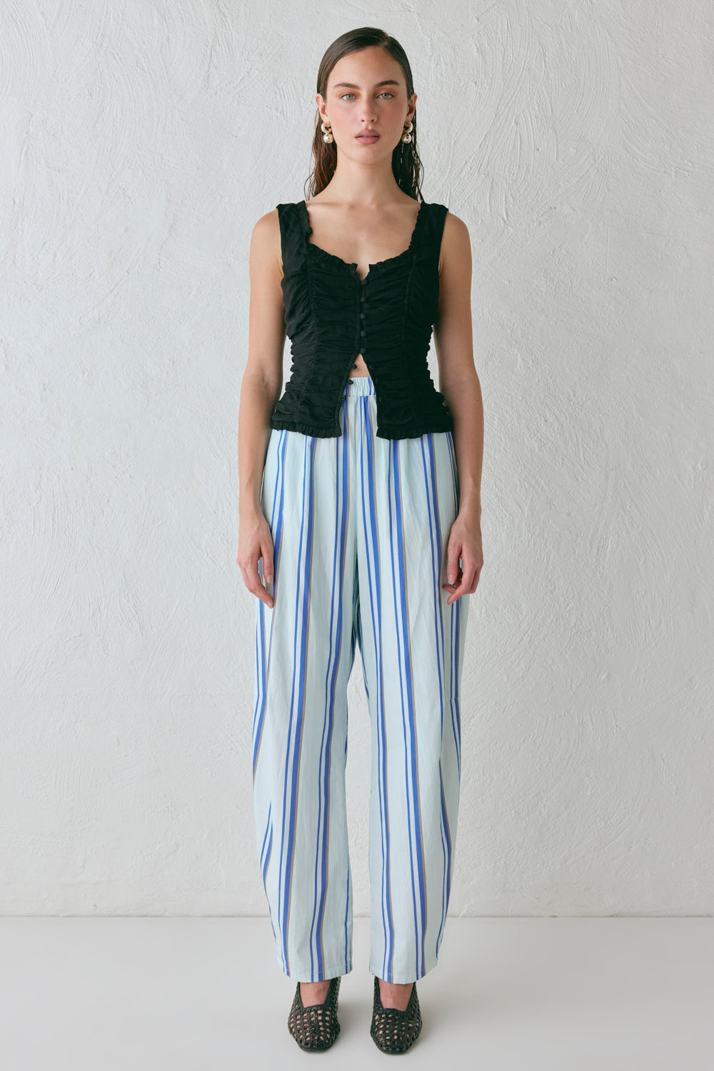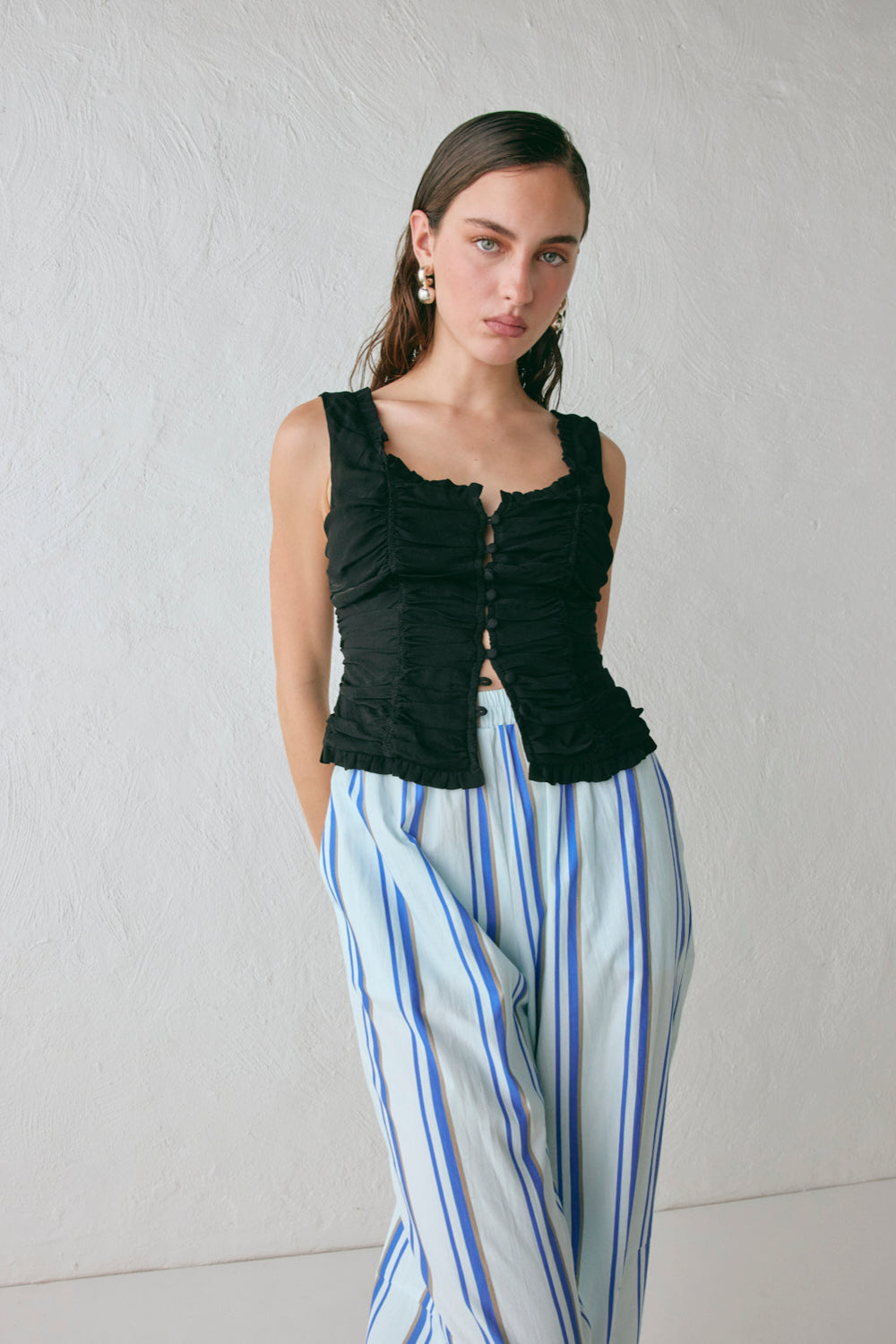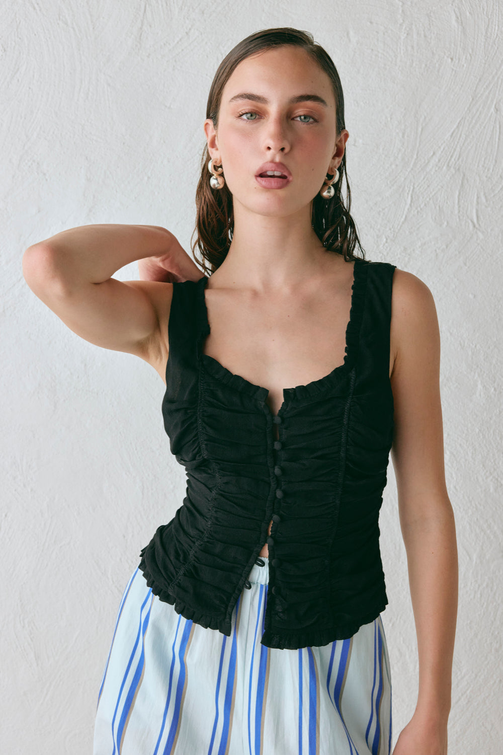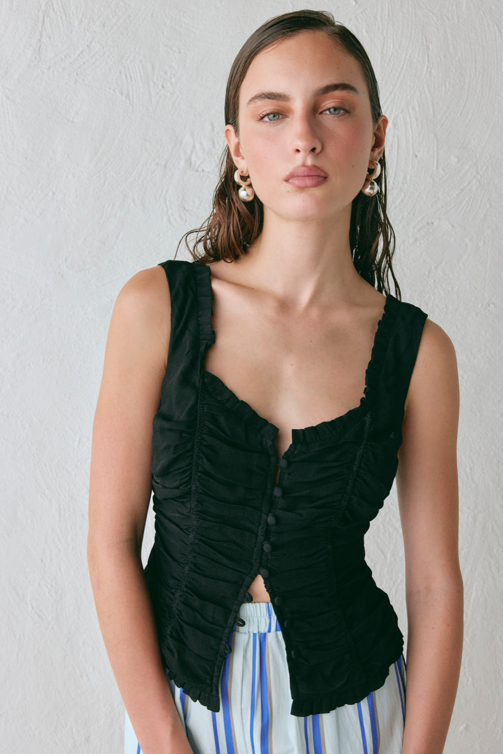 Introducing the Vida Top, now in Black. Featuring ruched elastic panels, frill detailing and a button-up front closure. Designed in Australia.