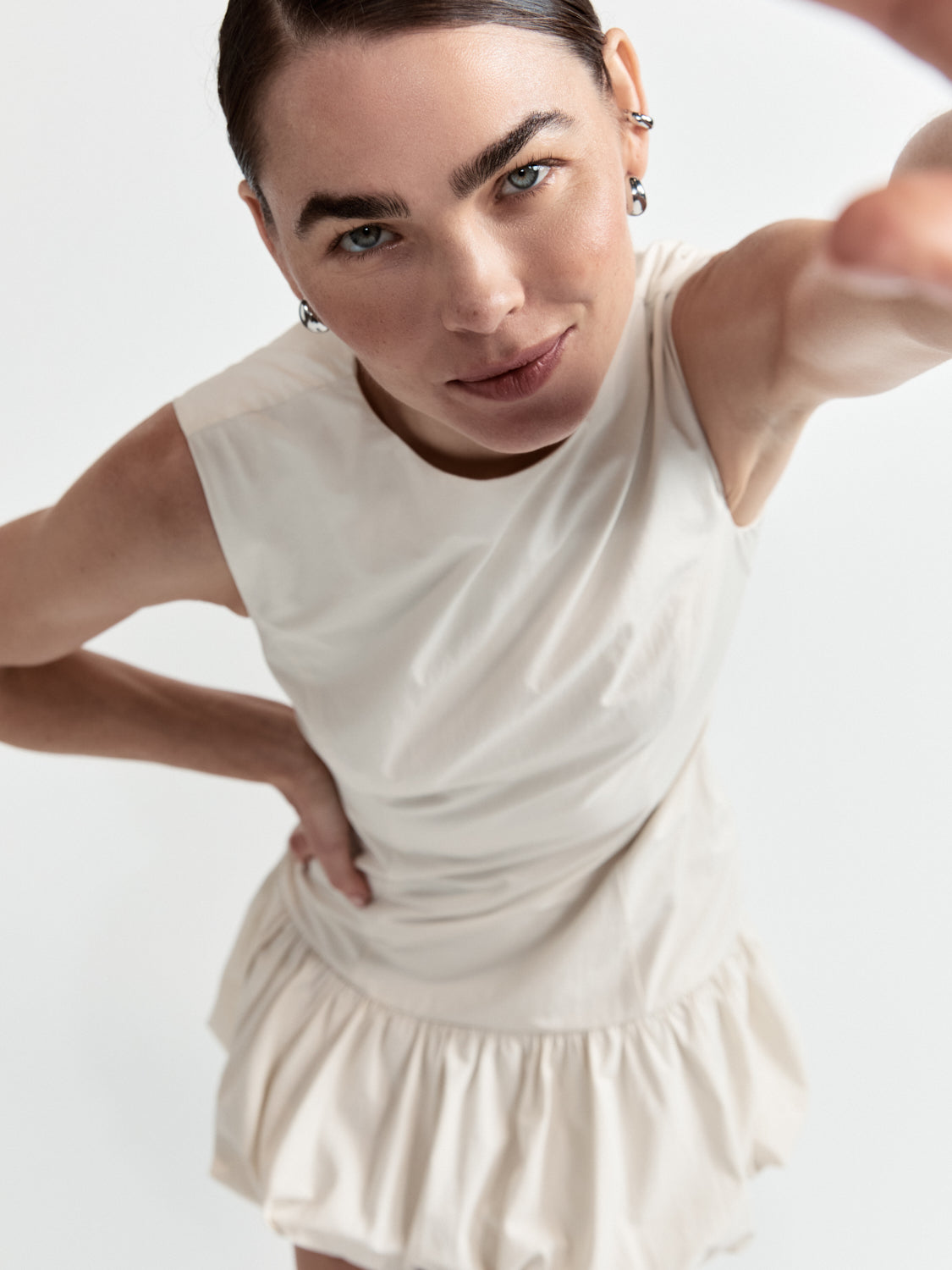 The Vikki Mini Dress in Cream. Made from 100% cotton, fully lined with a back zip and bubble hem. Designed in Australia.