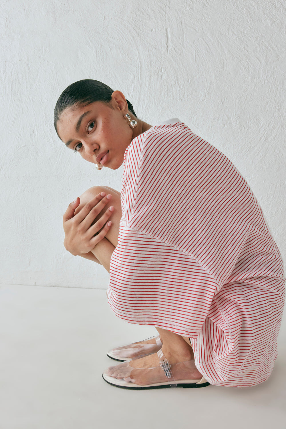 The Willow Tee in Red Stripe is crafted from a soft cotton blend with a slight stretch, featuring a contrast ribbed neckline for a classic touch. Designed in Australia.