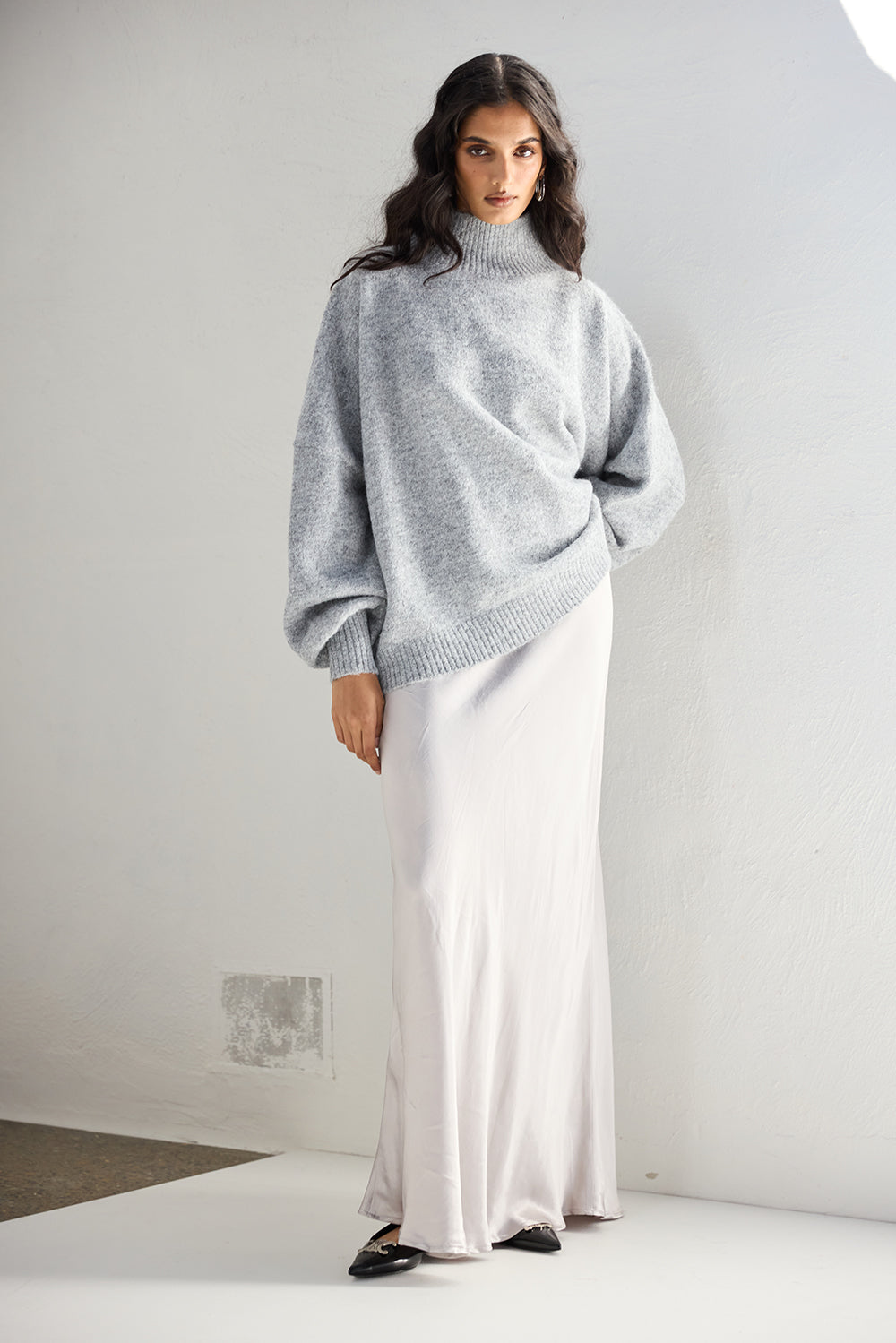 The Yumi Knit Jumper in Grey Marle. A stretch knit with high neck, ribbed neckline, cuffs and hem and oversized fit. Designed in Australia.