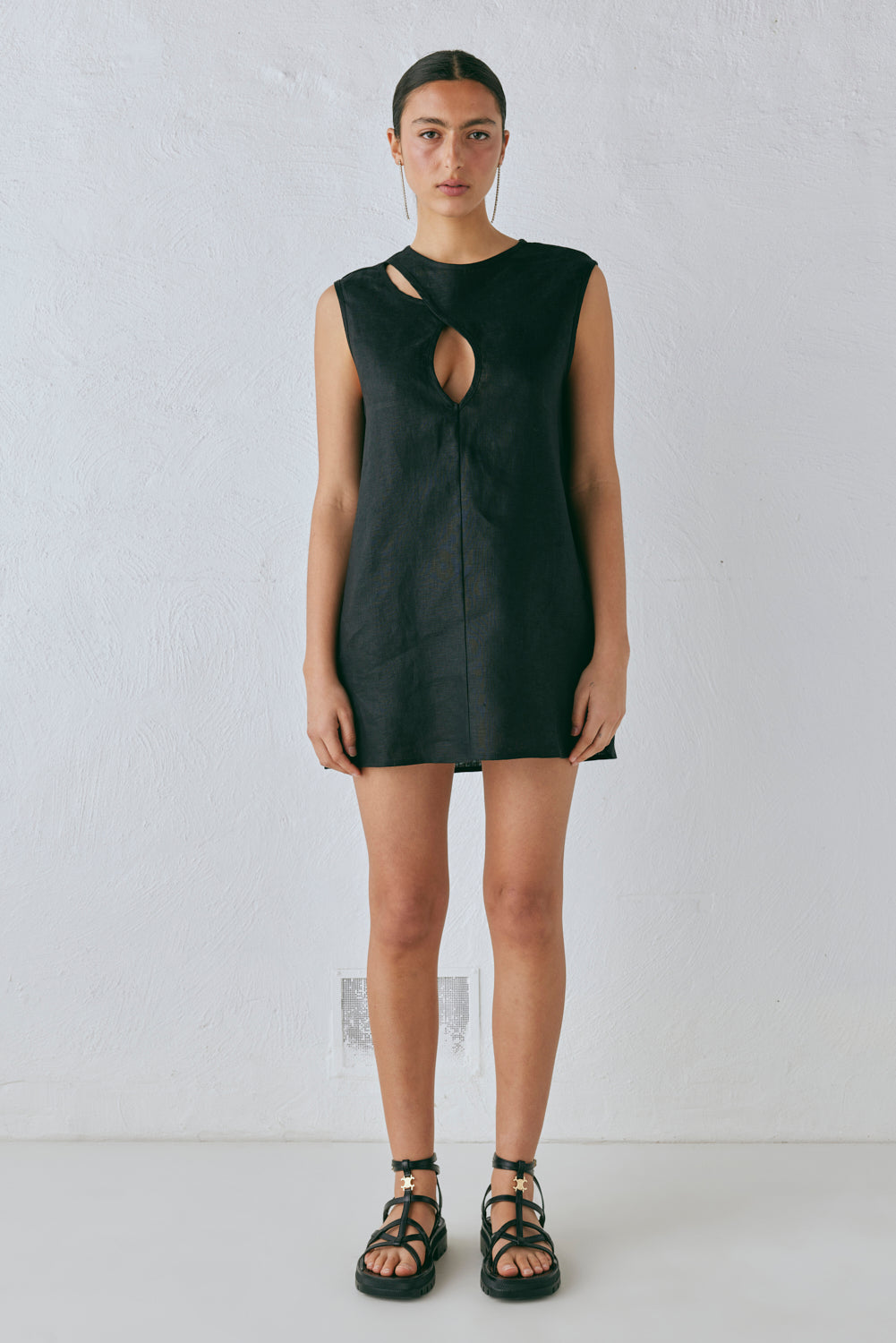 Yuri Linen Mini Dress Black made on 100% linen. Designed with a relaxed fit, front cut-out,  back keyhole cut out & side splits. Designed in Australia.